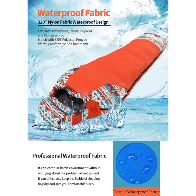 4 waterproof waterproof and breathable: the sleeping bag is waterproof and breathable with 400t tear-resistant and water-repellent fabric. It is anti-dew and moisture proof. The water just drains from the bag, keeping it completely warm and fluffy!