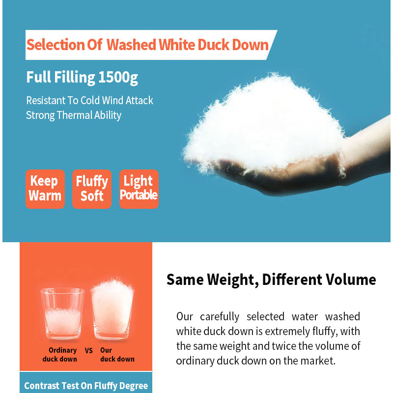 2. Split filling duck down technology ,1500g large filling volume,this sleeping bag is very thick after unfolding . with excellent resistance to cold and keeping warmth,it is a wise choice for camping out